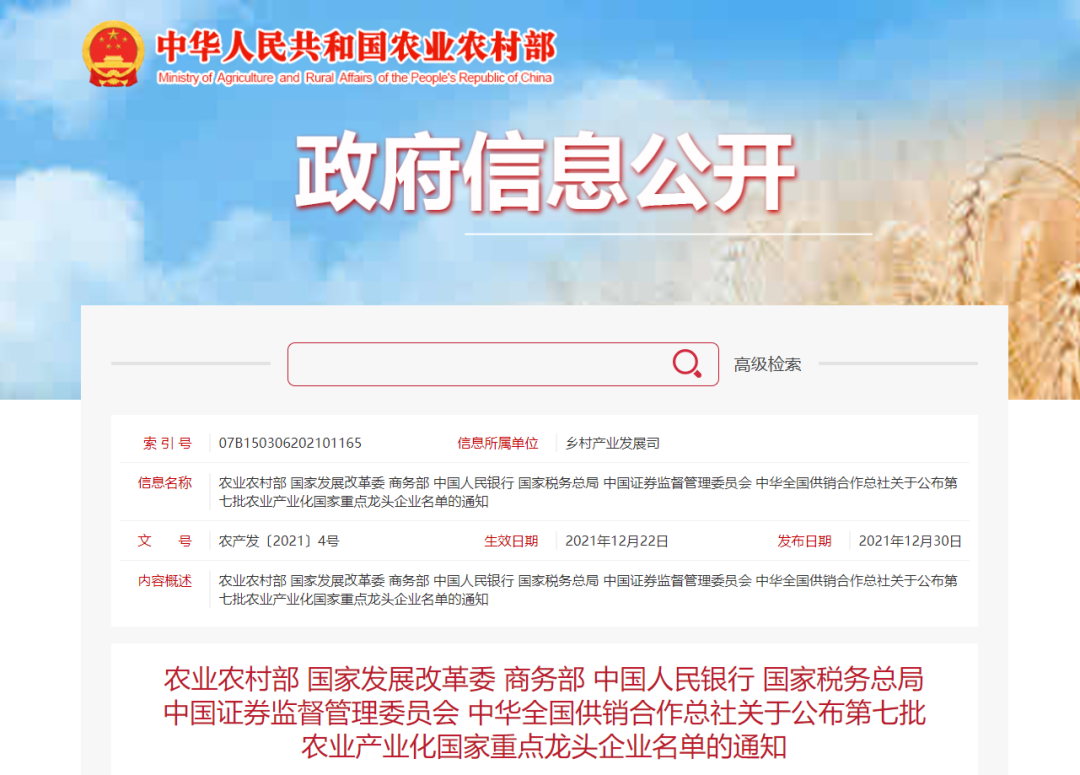 根據(jù)《農(nóng)業(yè)農(nóng)村部辦公廳關于開展第七批農(nóng)業(yè)產(chǎn)業(yè)化國家重點龍頭企業(yè)申報工作的通知》(農(nóng)辦產(chǎn)〔2021〕5號)要求和《農(nóng)業(yè)產(chǎn)業(yè)化國家重點龍頭企業(yè)認定和運行監(jiān)測管理辦法》(農(nóng)經(jīng)發(fā)〔2018〕1號)規(guī)定,農(nóng)業(yè)農(nóng)村部會同國家發(fā)展改革委、商務部、中國人民銀行、國家稅務總局、中國證券監(jiān)督管理委員會、中華全國供銷合作總社,組織開展了第七批農(nóng)業(yè)產(chǎn)業(yè)化國家重點龍頭企業(yè)認定工作。經(jīng)各省(區(qū)、市)遴選推薦、農(nóng)業(yè)農(nóng)村部組織專家評審、全國農(nóng)業(yè)產(chǎn)業(yè)化聯(lián)席會議審議、公示,決定認定北京臻味坊食品有限公司等412家企業(yè)為農(nóng)業(yè)產(chǎn)業(yè)化國家重點龍頭企業(yè),有效期到2024年監(jiān)測結果公布前。