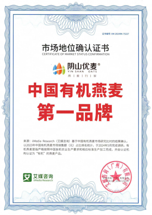 2024年5月,陰山優(yōu)麥獲艾媒咨詢授予的“中國有機(jī)燕麥第、一品牌”市場地位認(rèn)證書,此項認(rèn)證,是陰山優(yōu)麥品牌發(fā)展史上的一個重要里程碑,標(biāo)志著陰山優(yōu)麥在有機(jī)燕麥行業(yè)取得領(lǐng)導(dǎo)地位。