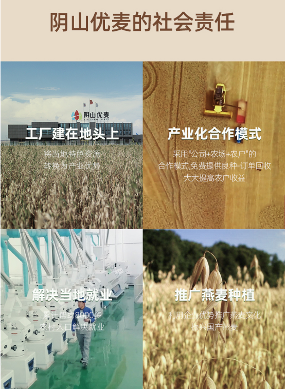 陰山優(yōu)麥在追求企業(yè)發(fā)展的同時,不忘回饋社會,積極參與公益事業(yè),助力鄉(xiāng)村振興。公司通過加強(qiáng)農(nóng)企利益聯(lián)結(jié),把農(nóng)戶納入到燕麥產(chǎn)業(yè)中來,除了加大土地流轉(zhuǎn),讓農(nóng)民取得穩(wěn)定的地租收益,還通過訂單模式,約定燕麥原糧回收保底價格,幫助農(nóng)民解決“賣難”問題。而且,陰山優(yōu)麥每年還為農(nóng)民捐贈燕麥良種、提供技術(shù)培訓(xùn)、增加就業(yè)崗位,幫助農(nóng)民增收致富。在陰山優(yōu)麥的帶動下,當(dāng)?shù)剞r(nóng)戶對種植燕麥的積極性大幅增加,當(dāng)?shù)匮帑湻N植面積和原糧價格也逐漸提升,進(jìn)一步推動了當(dāng)?shù)匮帑湲a(chǎn)業(yè)邁向規(guī)?;?、現(xiàn)代化、產(chǎn)業(yè)化發(fā)展的新臺階。